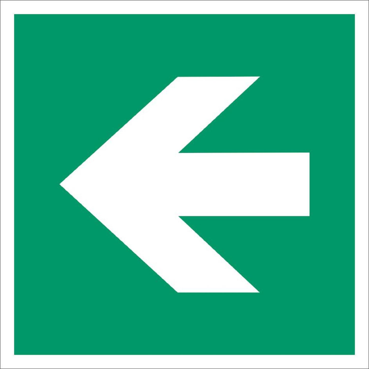 Denna utrymningsskylt har piktogram enligt ISO-standard 7010. Observera att pilen måste kombineras med en piktogram för att följa gällande regler.