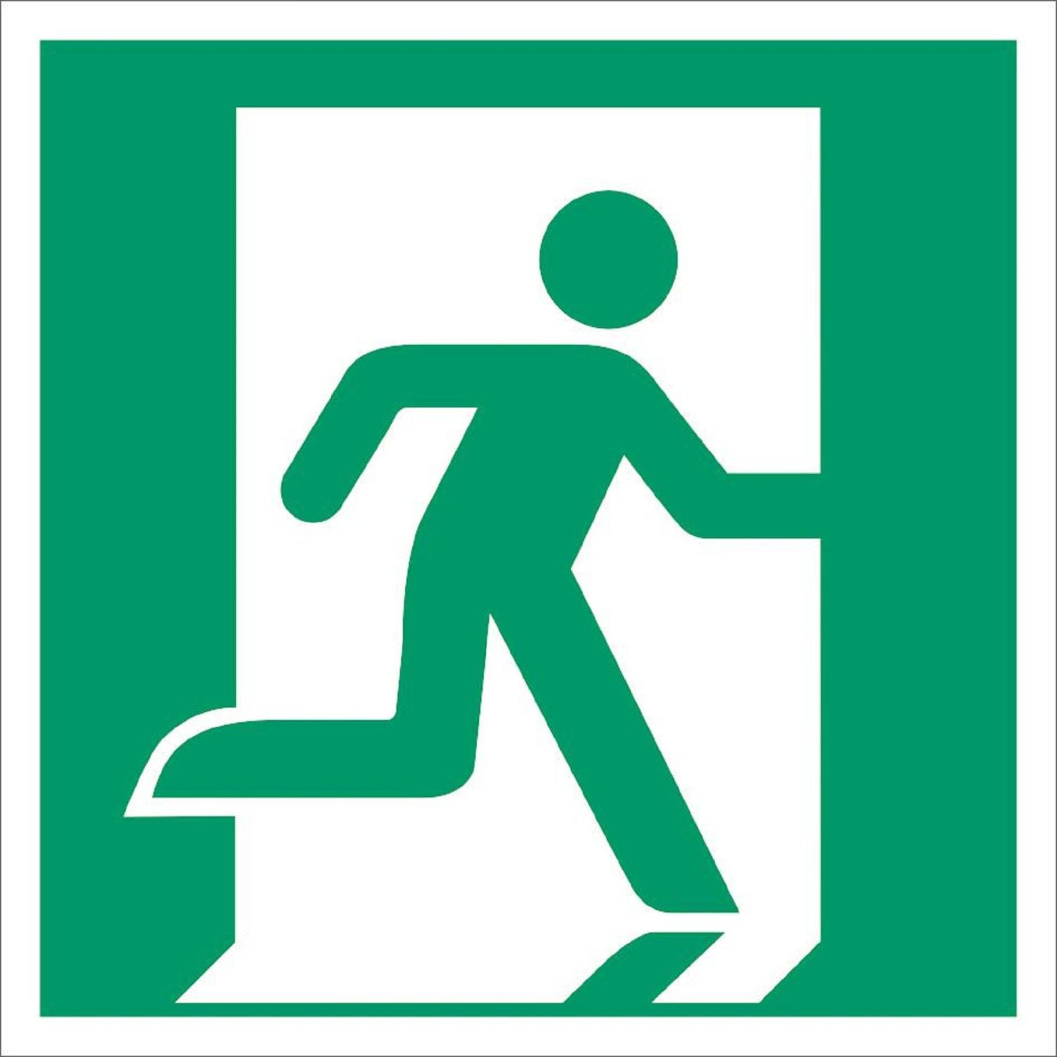 Denna utrymningsskylt har piktogram enligt ISO-standard 7010. Observera att piktogrammet måste kombineras med en pil för att följa gällande regler.